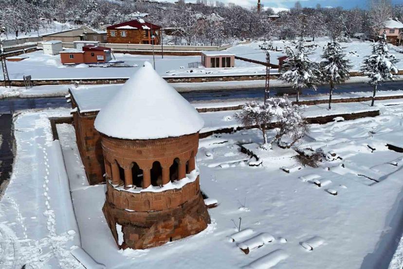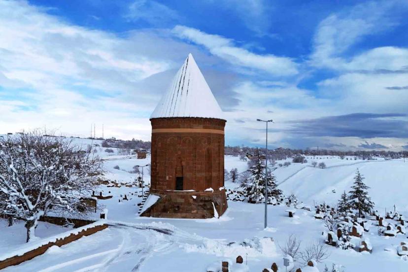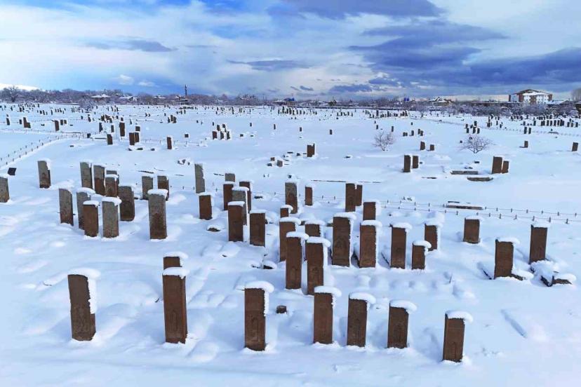 UNESCO Dünya Kültür Mirası Geçici Listesi’nde yer alan Selçuklu Meydan Mezarlığı’ndaki abidevi mezar taşları, kar örtüsüyle bütünleşerek dikkat çekici görüntüler oluşturdu.