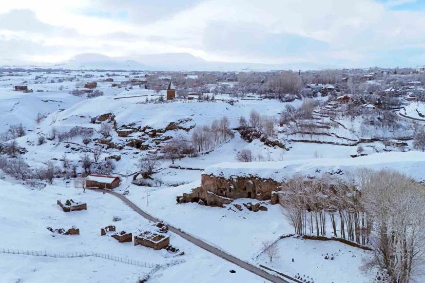 Bitlis’in Ahlat ilçesinde etkili olan kar yağışı sonrası tarihi mekânlar beyaza büründü, ortaya kartpostallık manzaralar çıktı.