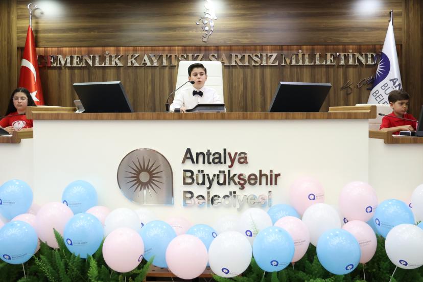 Antalya Büyükşehir Belediyesi Meclis toplantı salonu, 23 Nisan Ulusal Egemenlik ve Çocuk Bayramı'nda temsili çocuk meclis üyelerini ağırladı. Temsili Çocuk Meclisi'nde çocuklar istek ve taleplerini dile getirmek amacıyla meclis üyesi koltuklarına oturdu. Çocuk Meclisi Başkanı Ali Karademir başkanlığında toplanan mecliste tek tek söz alan çocuklar, taleplerini ve hayallerini paylaştı. Öğrenci Erva Aldemir ise 23 Nisan Çocuk Bildirgesi'ni okudu.