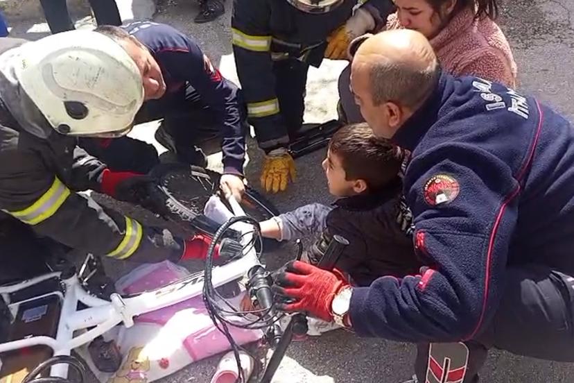 Ayağı bisiklete sıkışan çocuğu itfaiye kurtardı