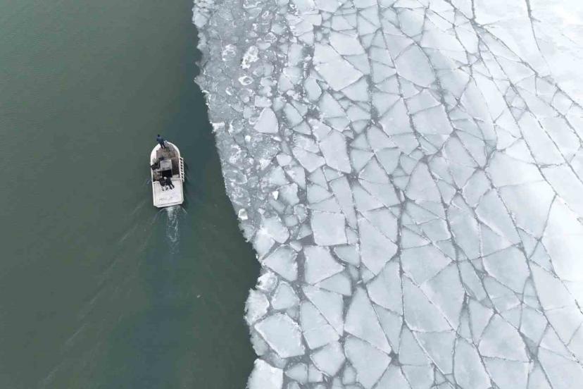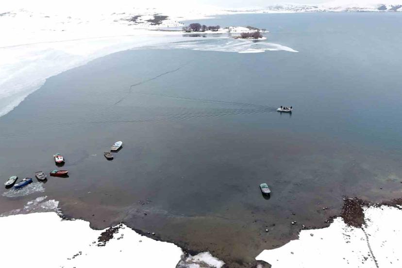 Bitlis’in Ahlat ilçesinde kış mevsiminde dondurucu soğuk nedeniyle yüzeyi buz tutan Nazik Gölü’nün çözülmeye başlamasıyla balıkçı tekneleri avlanmak için göle açılmaya başladı.