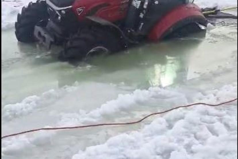 Ardahan’ın Çıldır ilçesindeki yüzeyi buz tutan Çıldır Gölü üzerinde kar temizleme çalışması yapan traktör, buzun kırılması sonucu suya gömüldü, sürücü son anda kurtarıldı.