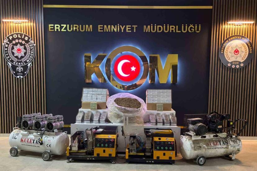 Tortum Cumhuriyet Başsavcılığı koordinesinde Kaçakçılık ve Organize Suçlarla Mücadele Şube Müdürlüğünce, 5607 sayılı Kaçakçılıkla Mücadele Kanunu kapsamında Tortum İlçesinde bir iş yeri ve sigara imalathanesine dönüştürülmüş depo görünümlü yerde yapılan çalışmada; 2 adet otomatik sigara doldurma makinesi, 2 adet kompresör, 5 bin adet doldurulmuş makaron, bin 584 adet gümrük kaçağı sigara sarma kağıdı, 33 bin 800 adet boş makaron, 10 kg açık kıyılmış tütün ve bin 500 adet şeffaf sigara poşeti ele geçirildi.