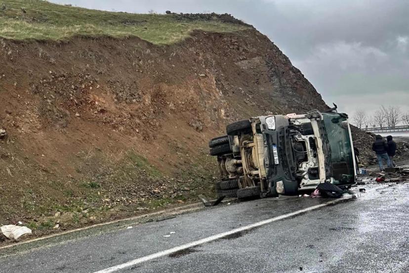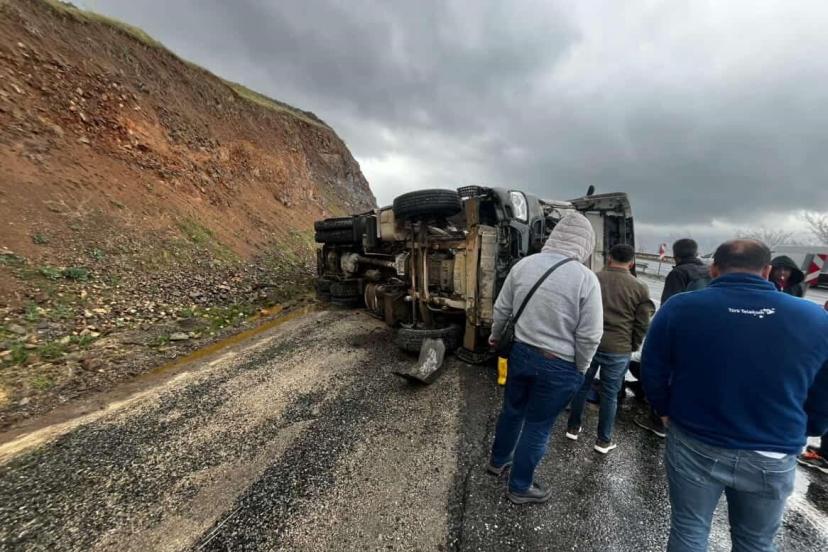 Elazığ’da yağıştan dolayı sürücüsünün direksiyon hakimiyetini kaybettiği beton pompa aracı yan yattı. Kazada 1 kişi yaralandı.
