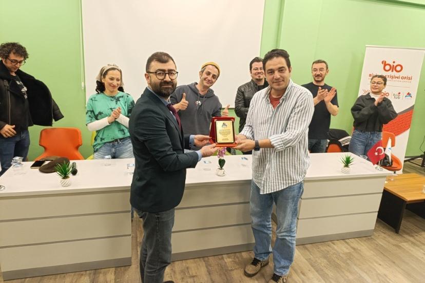 Bilim kafe etkinliği sonrasında Doğubayazıt Ahmed-i Hani Meslek Yüksekokulu Kızılay öğrenci Kulübü tarafından söyleşinin moderatörü ve organizasyonunu gerçekleştiren Öğr. Gör. Mustafa Bilirdönmez’e teşekkür plaketi takdim edildi.