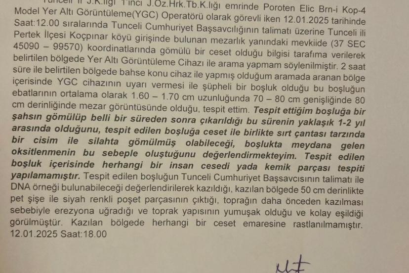 Olayla ilgili Tunceli Cumhuriyet Savcılığı tarafından çalışmalar sürerken, Gülistan Doku’nun öldürüldükten sonra Pertek ilçesine bağlı Koçpınar köyünde bulunan Hasan Halife Türbesi yakınlarına gömüldüğü iddia edilmişti. Geçtiğimiz yıl jandarma ekipleri tarafından ‘Yeraltı Görüntüleme’ cihazıyla arama yapılmış şüpheli bir boşluk tespit edilmişti. Boşluğun olduğu ebatların ortalama olarak 1.60-1.70 metre uzunluğunda, 70-80 cm genişliğinde ve 80 cm derinliğinde, mezar görüntüsünde olduğu tespit edildiği fakat herhangi bir kemik veya insan cesedine rastlanmadığı raporlanmıştı.