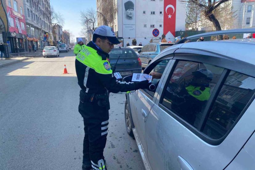 Kars Emniyet Müdürlüğü Trafik Denetleme Şube Müdürlüğü ekiplerince kent genelinde sürdürülen çalışmalar çerçevesinde sürücüler ve yayalar trafik kurallarına uymaları konusunda uyarılırken, bilinçlendirme amacıyla broşür dağıtımı yapıldı.