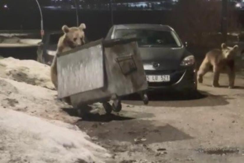 Kars’ın Sarıkamış ilçesinde yerleşim alanına inen bozayılar, çöpte yiyecek ararken görüntülendi.