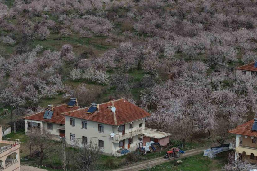 Baskil’de kayısı bahçeleri çiçek açtı, beyaza bürünen ağaçlar havadan görüntülendi. Geçen yıl don olayında zarar gören üreticiler bu sezon hasada umutla bakıyor.