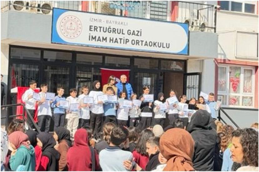 İzmir’in Bayraklı ilçesindeki Ertuğrul Gazi İmam Hatip Ortaokulu’nda Kur’an-ı Kerim’e geçiş programı düzenlendi. Programda Kur’an okumaya geçen öğrencilere Kur’an-ı Kerim hediye edildi.