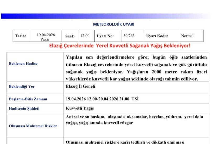 Meteoroloji 13. Bölge Müdürlüğü tarafından yapılan uyarıda, "Yapılan son değerlendirmelere göre; bugün öğle saatlerinden itibaren Elazığ çevrelerinde yerel kuvvetli sağanak ve gök gürültülü sağanak yağış bekleniyor. Yağışların 2000 metre rakım üzeri yükseklerde kuvvetli kar yağışı şeklinde olacağı tahmin ediliyor. Oluşması muhtemel risklere karşı tedbirli ve dikkatli olunması gerekmektedir" denildi.