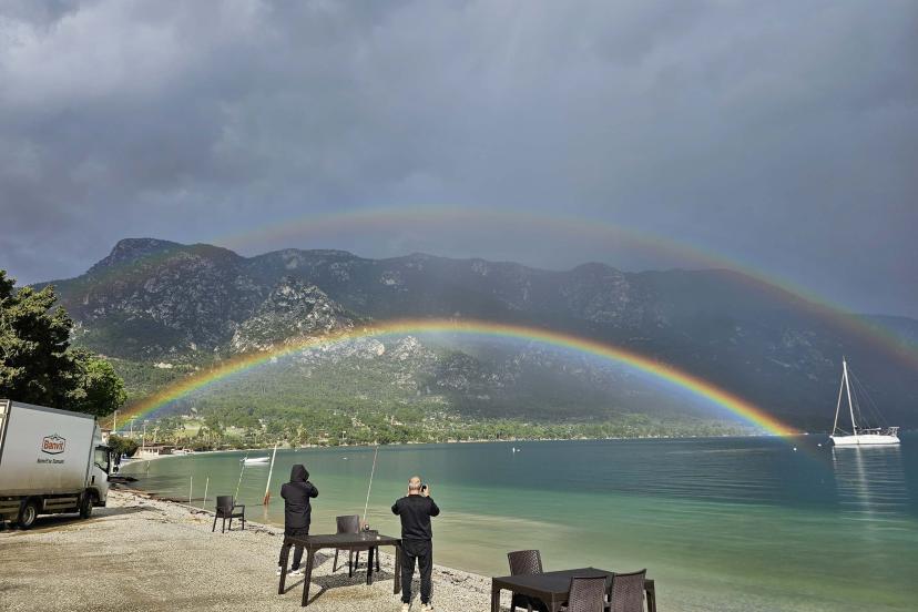 Menteşe ilçesinde dün sabah saatlerinden itibaren sağanak, etkili oldu. Akbük Sahili'nde yağmur bulutlarının bir anda dağılıp güneşin yüzünü göstermesiyle, çift gökkuşağı ortaya çıktı. Çift gökkuşağı görenleri hayran bıraktı. Gökkuşağının sunduğu görsel manzara vatandaşlar tarafından cep telefonlarıyla kaydedildi.