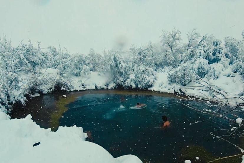 Muhteşem manzarada üç arkadaş kar yağışı altında gölette yüzdü