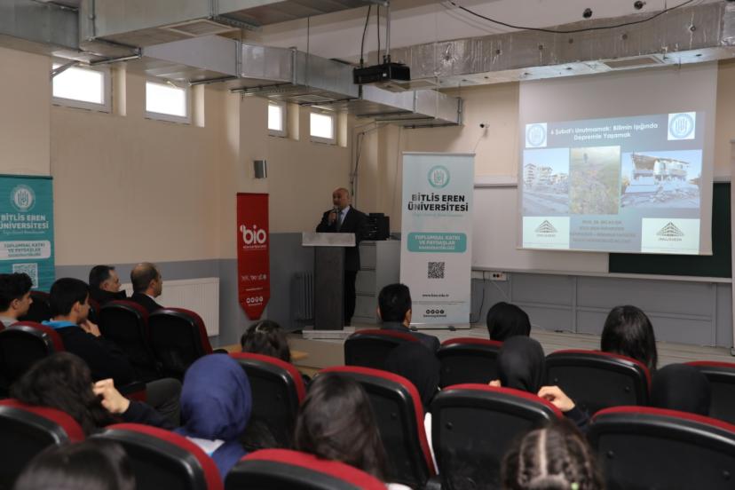 Bitlis Eren Üniversitesi, 6 Şubat’ta “6 Şubat’ı Unutmamak: Bilim Işığında Depremle Yaşamak” başlıklı bir konferans düzenledi. Katılımcılara deprem oluşum mekanizmaları, fay hatları ve afetlere karşı alınması gereken önlemler hakkında detaylı bilgiler verildi.
